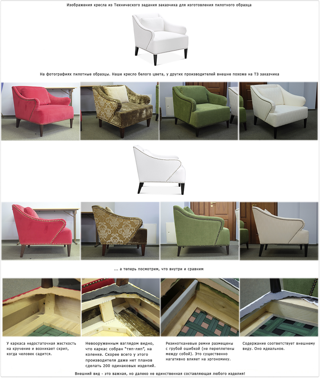 Экономия должна быть экономной. В стремлении сэкономить, многие инвесторы находят большое количество фабрик-кооперативов, которые предлагают сделать мебель для гостиницы. Не имея опыта, технологических знаний производства специализированной мебели, не имея доступа к поставкам импортных комплектующих, эти производители, опьяненные суммой крупного заказа, предлагают сделать мебель по очень привлекательной цене (они просто не знают, сколько стоит профессиональные комплектующие, и считают мебель по опыту, который у них уже есть). Ну и конечно они не сильно беспокоятся о своей репутации. Еще выставляя счет, знают, что не сделают такую мебель (сделают похожую) и точно не справятся со всем объемом в срок. Хорошо, что умные люди придумали «пилотный образец». Ведь если вам нужно купить себе 200 штанов вы захотите прежде примерить хотя бы одни, ну или, например, перед тем как организовать важный банкет Вы же попробуете по чуть-чуть блюда, которые Вам предлагают приготовить для гостей?! Конечно да. Вот и с мебелью то же самое. На ней надо сидеть! Щупать и осматривать вживую. Вы, наверняка, сталкивались с ситуацией когда, выходит новая модель автомобиля и ее уже показали в интернете, журнале и у Вас начинает формироваться какое-то мнение... но Вы вряд ли рискнете ее заказать, пока не увидите вживую, не возьмете тест-драйв и не прокатитесь, не ощупаете салон, не проверите удобно ли Вам... И я уверен, что были случаи, когда Ваши ожидания не оправдывались. Это бывает. Вы думаете, что все красиво и отлично, а, например, Вам не удобно сидеть! И что делать? Неужели Вы смиритесь с этим? Или, например, выясниться, что подлокотник слишком низко - не так как Вы привыкли, Вам уже будет не комфортно. Вот и с диванами, креслами, стульями и другой мебелью для гостиниц точно так же. Ее надо тестировать на «живом» образце. Это один из самых проверенных способов «отсеять» совсем недобросовестных производителей «мебельных продуктов», которые не могут сделать образец похожий, как на картинке. А ведь это совсем не так просто, как может показаться. Это, конечно, не автомобиль новый изобрести, но, совершенно ответственно, заявляем – «СДЕЛАТЬ НЕ ПРОСТО!»