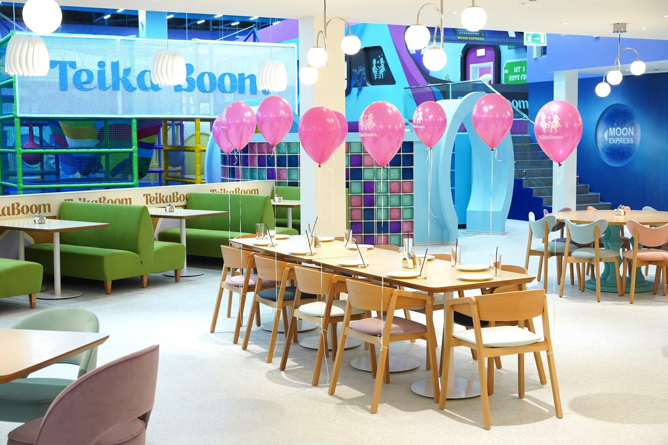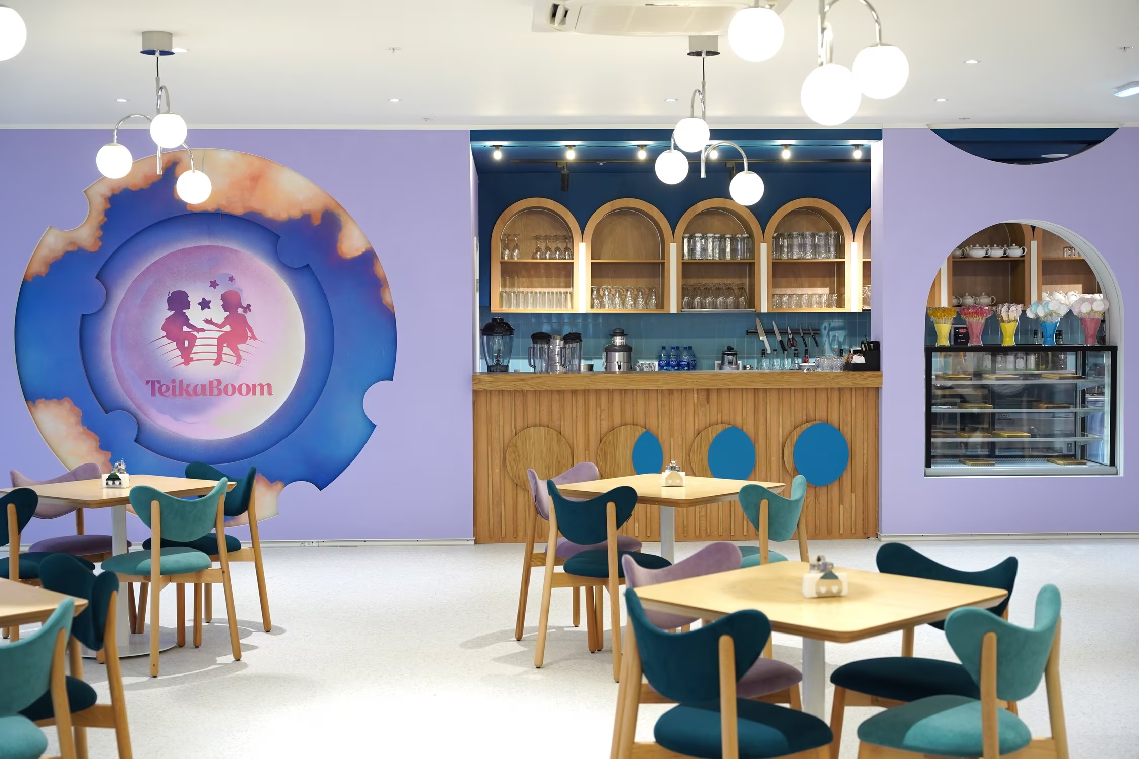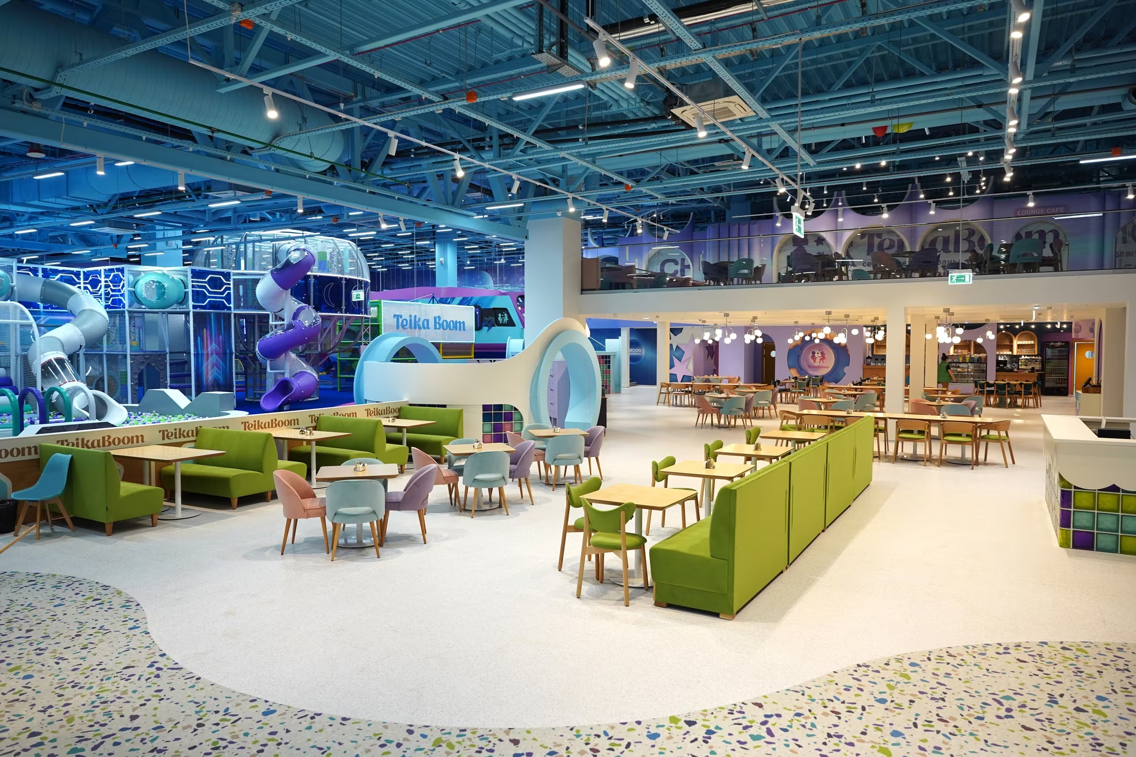 Тейка Бум в Екатеринбурге – яркий, просторный детский развлекательный центр. Пространство разделено на зоны: большая игровая площадка с горками и тоннелями плавно переходит в кофейно-отдыхающую зону, где размещены яркие диваны, мягкие банкетки и оригинальные стулья. Насыщенные, но мягкие цвета (лайм, пастельные розовый и голубой, лавандовый) создают весёлую, уютную атмосферу и не отвлекают от игры, а наоборот – поддерживают общую концепцию центра.